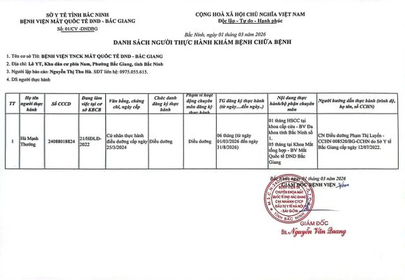 Danh sách Người thực hành Khám bệnh chữa bệnh tại Bệnh viện TNCK Mắt Quốc tế DND – Bắc Giang