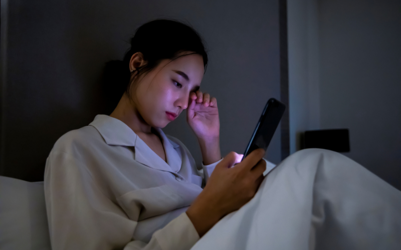 – Ảnh hưởng tới não bộ & Tâm lý: Ánh sáng xanh từ màn hình điện thoại gây mất ngủ, dẫn đến đầu óc căng thẳng.