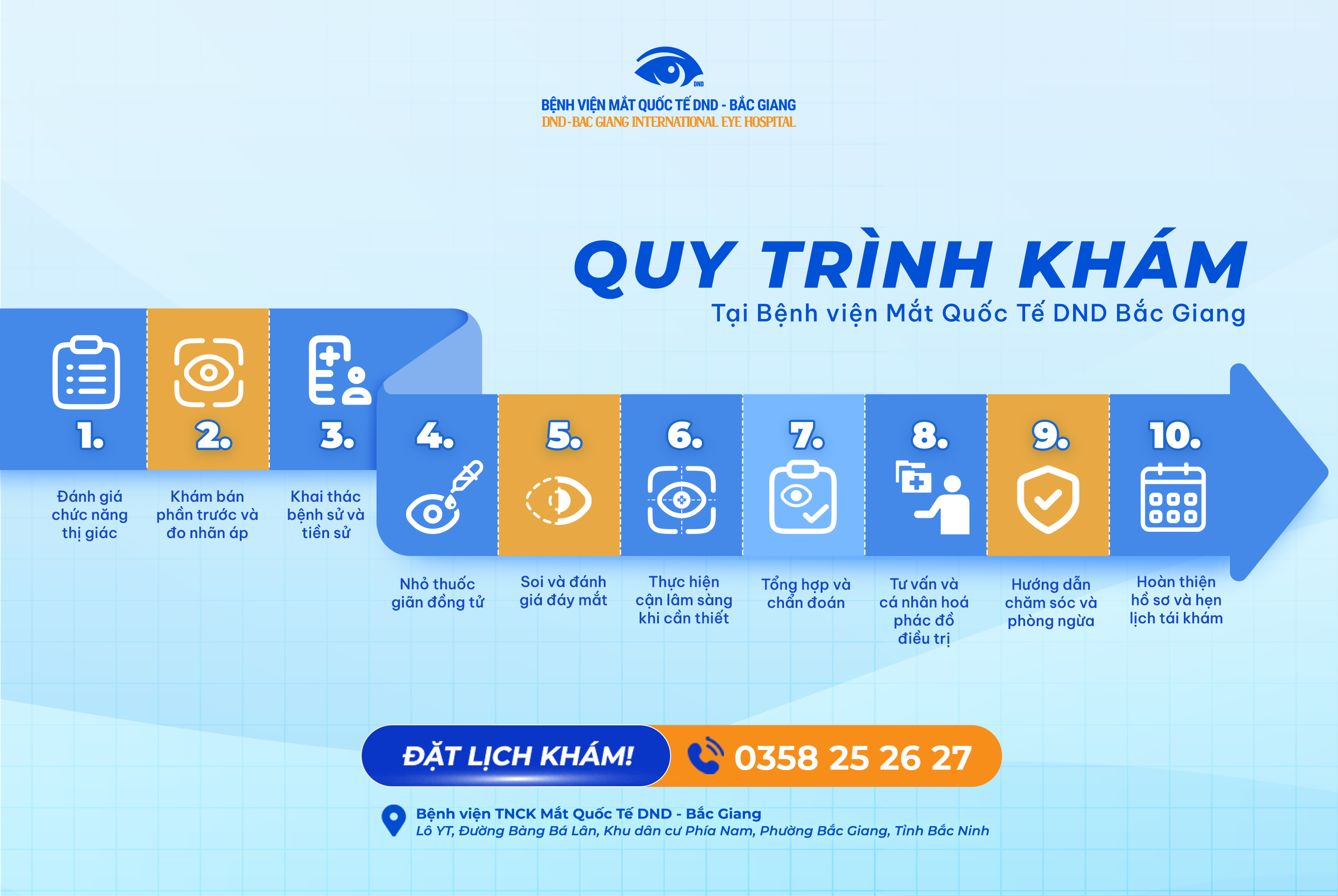 Để mang lại kết quả chẩn đoán chính xác nhất, mỗi khách hàng tại Bệnh viện Mắt Quốc tế DND Bắc Giang đều được thực hiện thăm khám chuyên sâu gồm 10 bước: